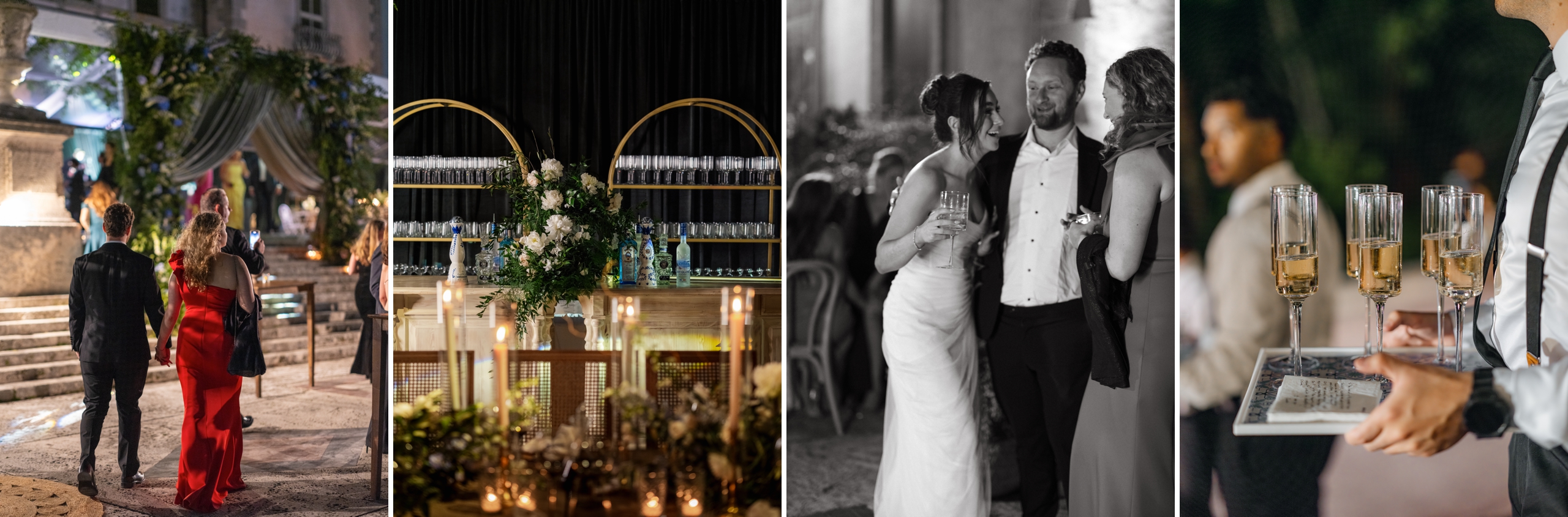Alessandra and Zachary had a quiet morning getting ready with their closest family and friends. She changed into a stunning Monique Lhuillier gown and met Zachary at a corner in Vizcaya for a private first look before the ceremony. We ran around the venue, chasing the light and stealing away quiet moments until the sun set and the ceremony began. Although it was dark, this outdoor ceremony shone in every way imaginable. The majestic lavender canopy, lustrous gold walkway, the candles dotting the aisle, we couldn’t get over the attention to detail Lisi Korn paid to bring this ceremony to life! The two tied the knot, and everyone (including us) got a little misty-eyed. Everybody headed into the reception, and our breath was taken away. It felt like we entered an Italian courtyard! With the cacio e Pepe bar, kissing booth, gelato stand, and luxurious florals, we didn’t know where to start! Everybody danced the night away, munching on Italian delicacies. When it was time to cut the cake, we watched as a team of chefs rolled out an authentic Italian cake they had been preparing live in front of the guests! We loved spending the night with these two in their Italian fairytale in the heart of Miami.