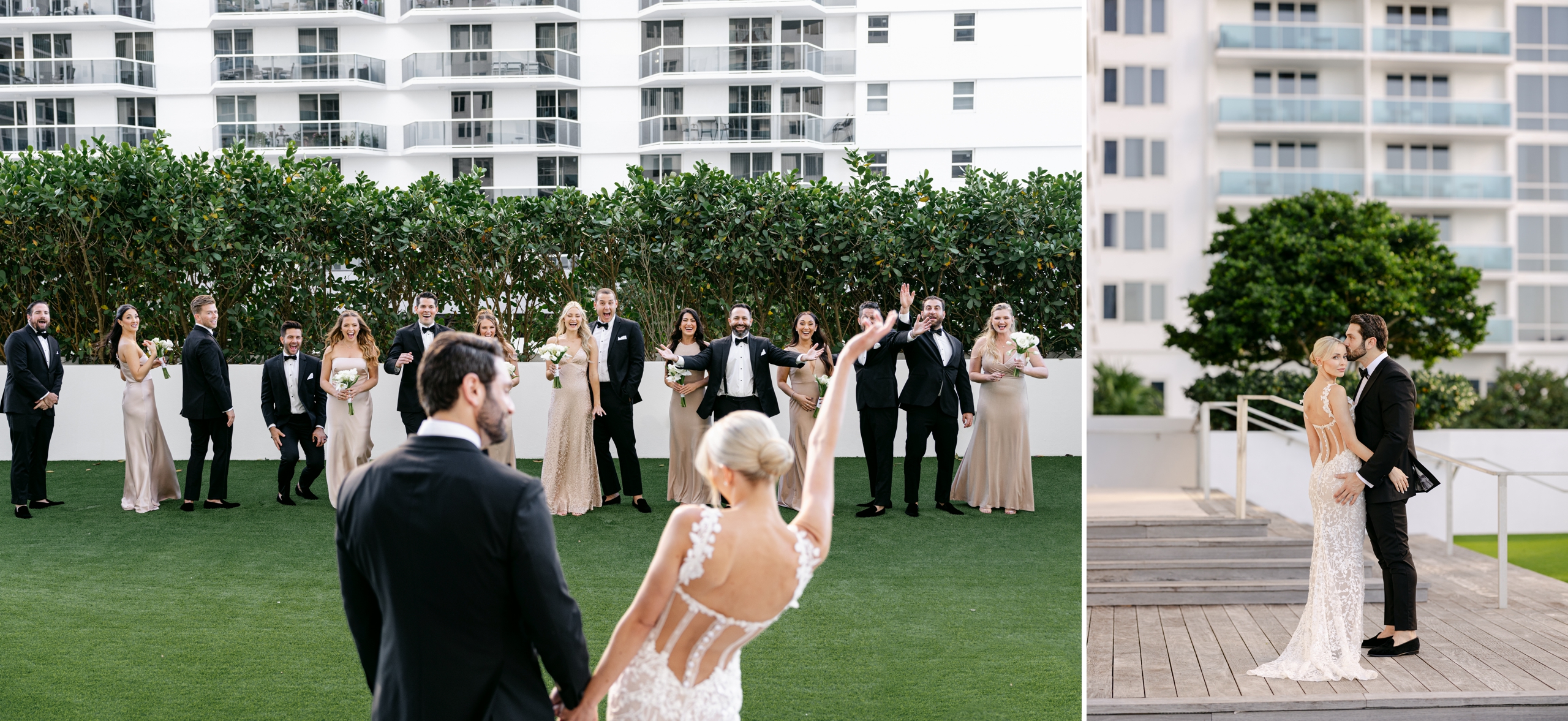 Angela and her bridesmaids got ready at the Four Seasons Brickell and walked over to the roof top for a teary first look, surrounded by the couple’s family and friends. The ceremony was at St. Jude Catholic Church, the church that Angela’s family have been involved with for generations. Tying in a piece of family history into their wedding ceremony was a special moment for everyone. The ceremony was followed by a tasteful cocktail hour, allowing guests to mingle and soak in the views.Then came the reception. To say the decor was jaw-dropping is an understatement. The stunning florals, done by Tantawan Bloom were absolutely amazing, adding an extra touch of luxury. The duo danced all night to live music as confetti cannons went off. The wedding party paraded throughout the hotel lobby and headed toward their next destination: Zero’s Piano Bar, a piano bar dedicated to Angela’s dog! They sang karaoke and laughed the night away. We loved every bit of this wedding, it was a night to remember!
