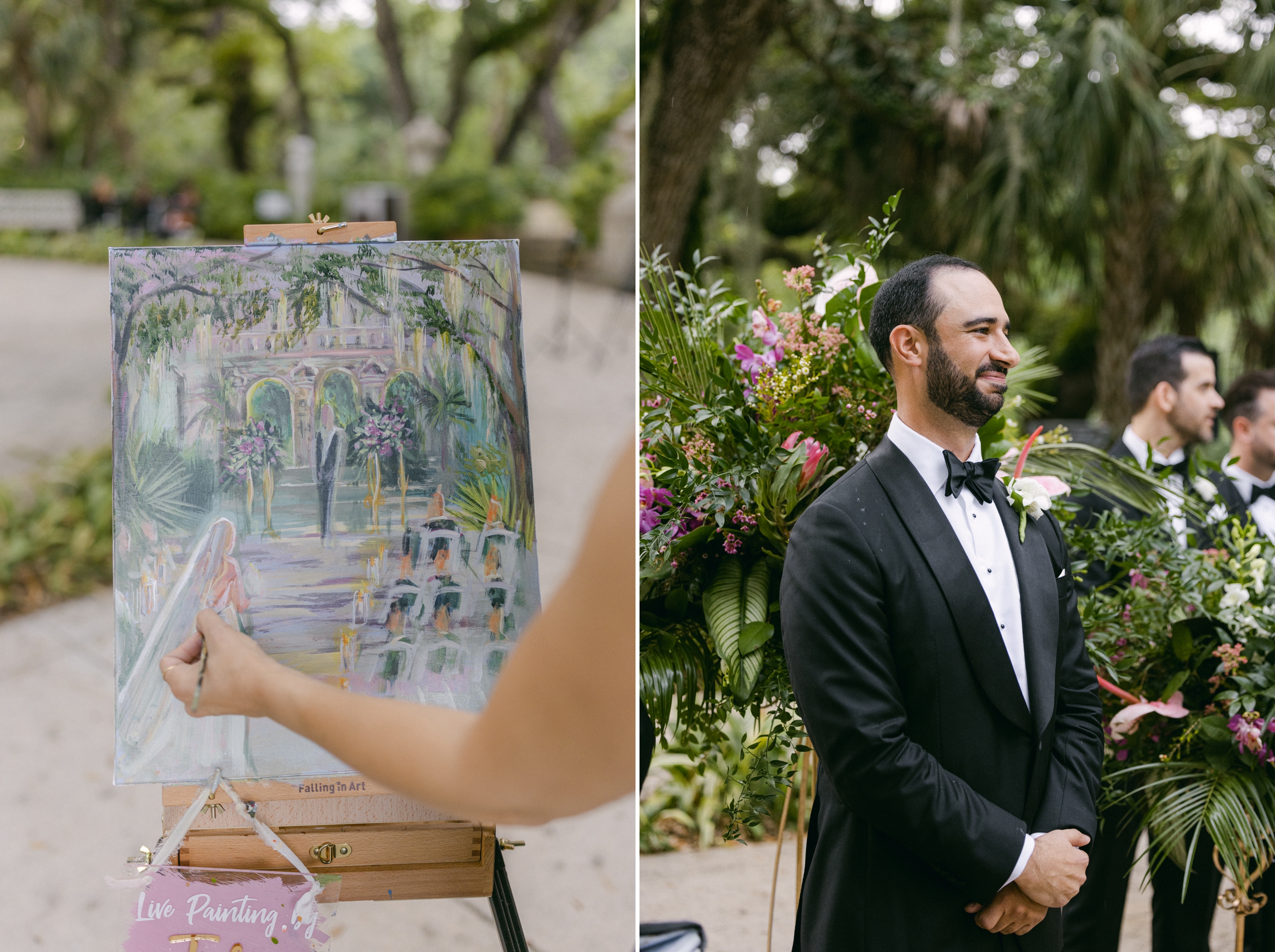Anne and Danny’s Miami wedding was elegant and timeless. The pair got ready as they opened gifts from each other to wear on the special day. They met in a secret spot at Vizcaya Museum & Gardens, where they shared an intimate first look and privately exchanged vows before the ceremony. The outdoor garden ceremony was lovely, featuring a string trio and live painter. There wasn’t a dry eye in sight as these lovebirds tied the knot. Anne and Danny explored the gardens taking portraits as their guests sipped their drinks and meandered through the venue during cocktail hour. The two took a sneak peek at their wedding reception decor, with lush tropical florals and twinkling lights. The outdoor reception began as the sun went down and the stars began to twinkle. Although everybody danced into the night, Vizcaya was never brighter on their special day!