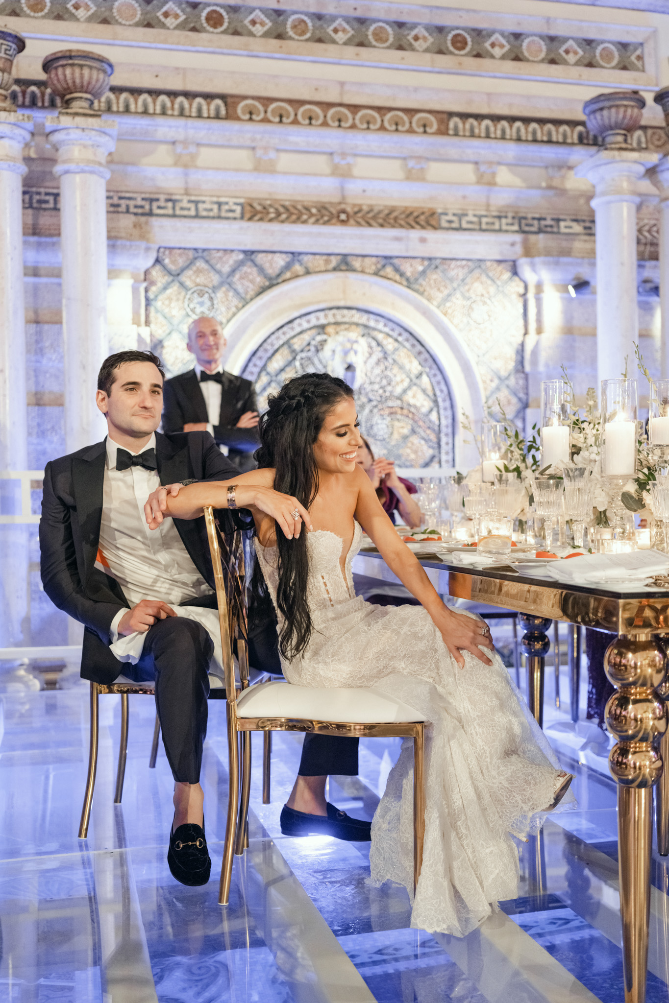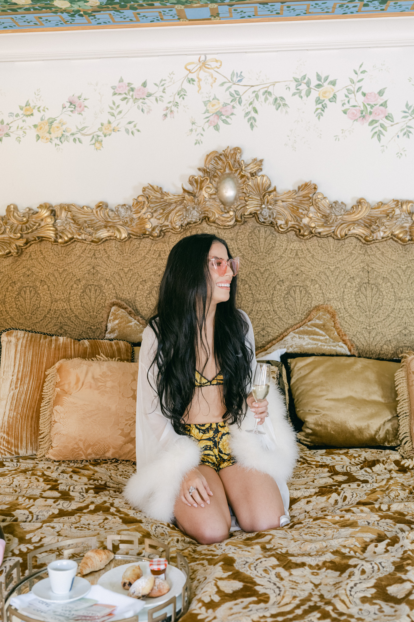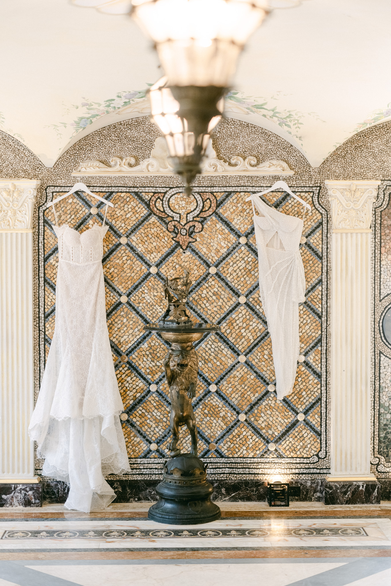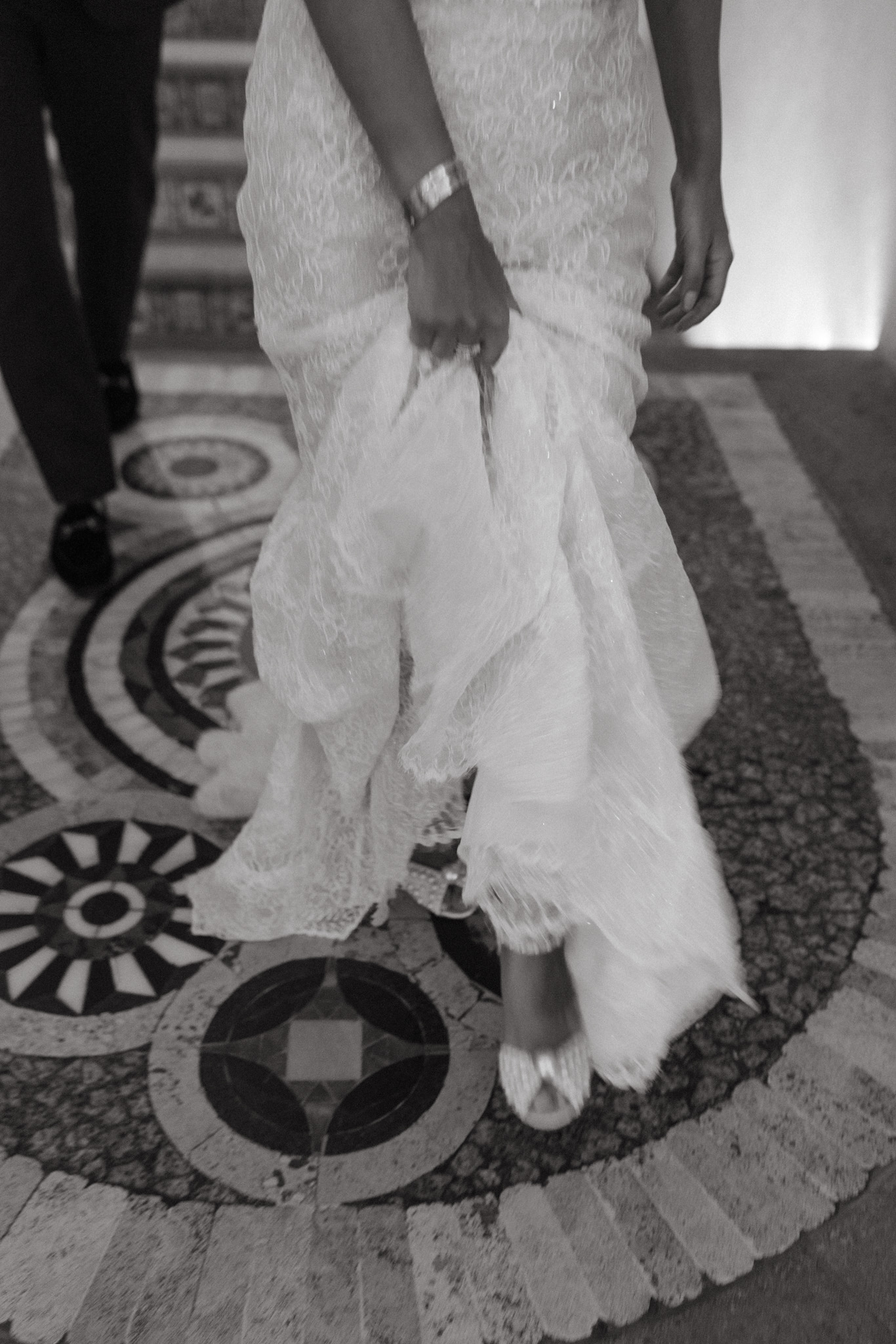 There was no shortage of designer apparel to go with the equally opulent wedding that took place at the Versace Mansion. Consuelo donned a Versace top and bottom for getting ready complete with pink Versace slippers and Gilda & Pearl robe from Harrods. She slipped into her Lee Petra wedding gown with Jimmy Choo shoes for the ceremony which took place in the courtyard of the mansion. For the reception in the backyard, the famous Versace tiled pool was covered in chic clear acrylic where guests danced and dined. Here is where Consuelo changed into her second Lee Petra dress with a pair of stunning Renee Caovilla shoes that took her well into the night.