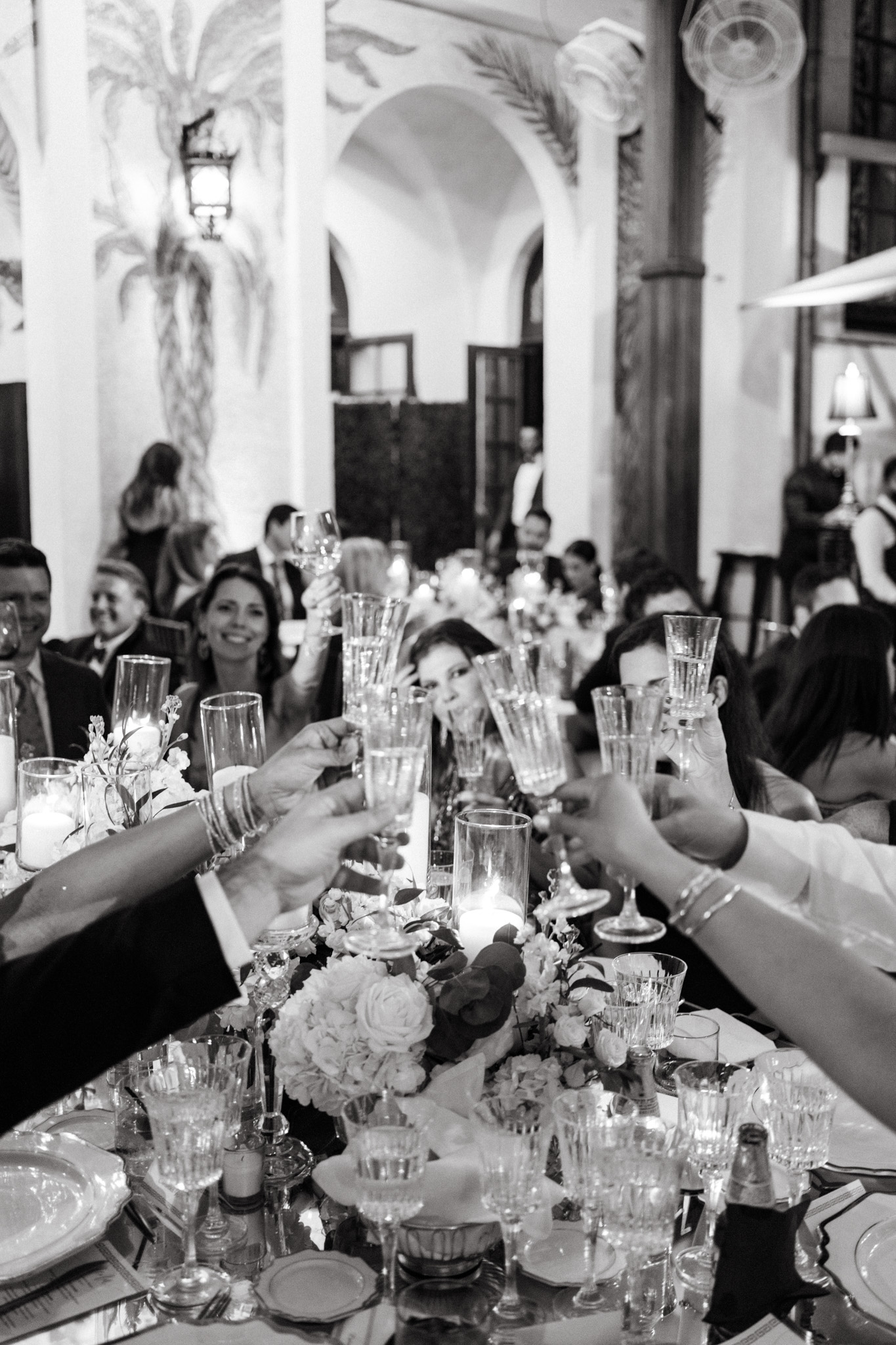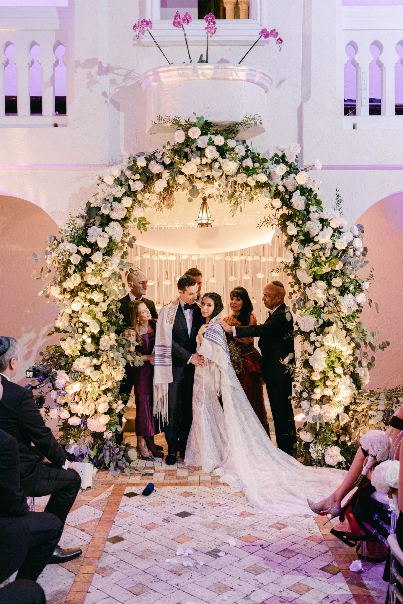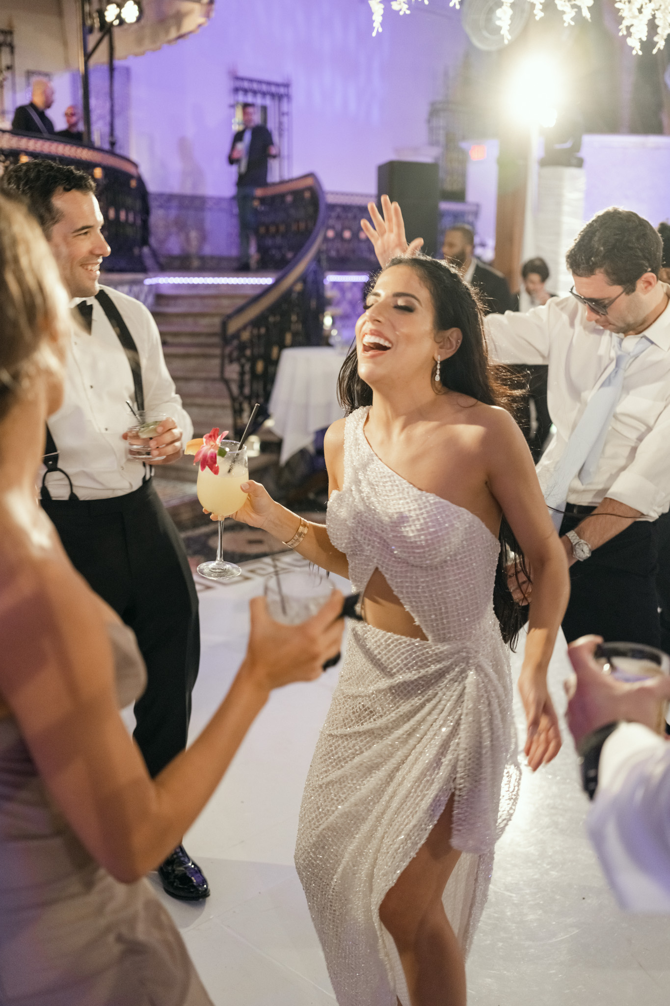 There was no shortage of designer apparel to go with the equally opulent wedding that took place at the Versace Mansion. Consuelo donned a Versace top and bottom for getting ready complete with pink Versace slippers and Gilda & Pearl robe from Harrods. She slipped into her Lee Petra wedding gown with Jimmy Choo shoes for the ceremony which took place in the courtyard of the mansion. For the reception in the backyard, the famous Versace tiled pool was covered in chic clear acrylic where guests danced and dined. Here is where Consuelo changed into her second Lee Petra dress with a pair of stunning Renee Caovilla shoes that took her well into the night.