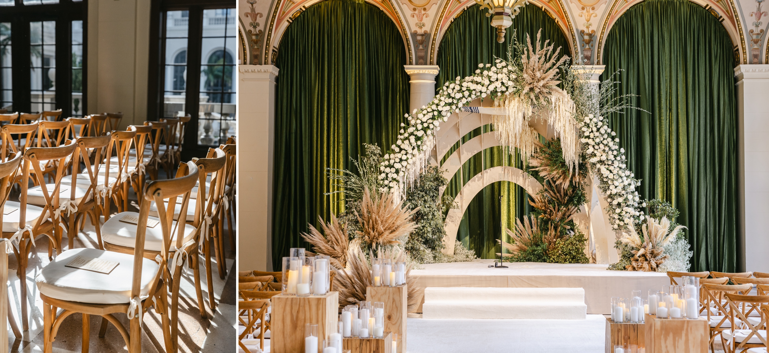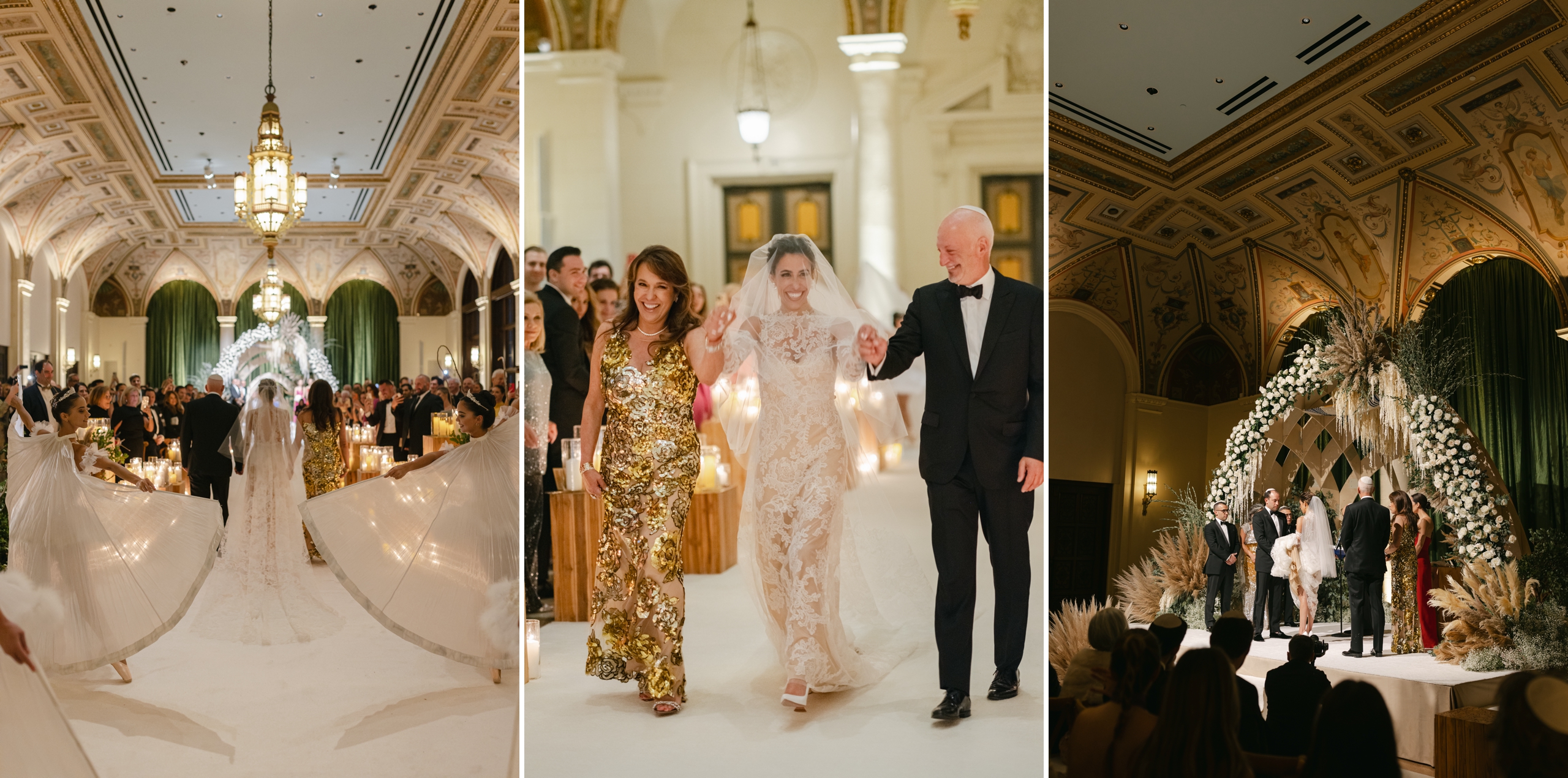 Their wedding was nothing short of magnificent, with grand details at every corner. The morning of was full of excitement as Gabby got ready overlooking the ocean. The two met for their first look on the lawn as we captured their sweet moments with each other and family. The ceremony was full of lush greens and pampas, transforming the room into a wonderland as the sunset peeked through the windows. As always, Birch Event Design captured the vision perfectly with the stunning florals. There wasn’t a dry eye in sight as the lovebirds tied the knot! The reception was absolutely enchanting, featuring dreamy florals, glass canopies, and twinkling candlelight. We were in awe at the attention to detail! Once the party started, it didn’t stop! Gabby and Michael danced the night away with their wedding party, professional dancers, and DJ! The pair partied all night, bringing life to the city of Palm Beach.