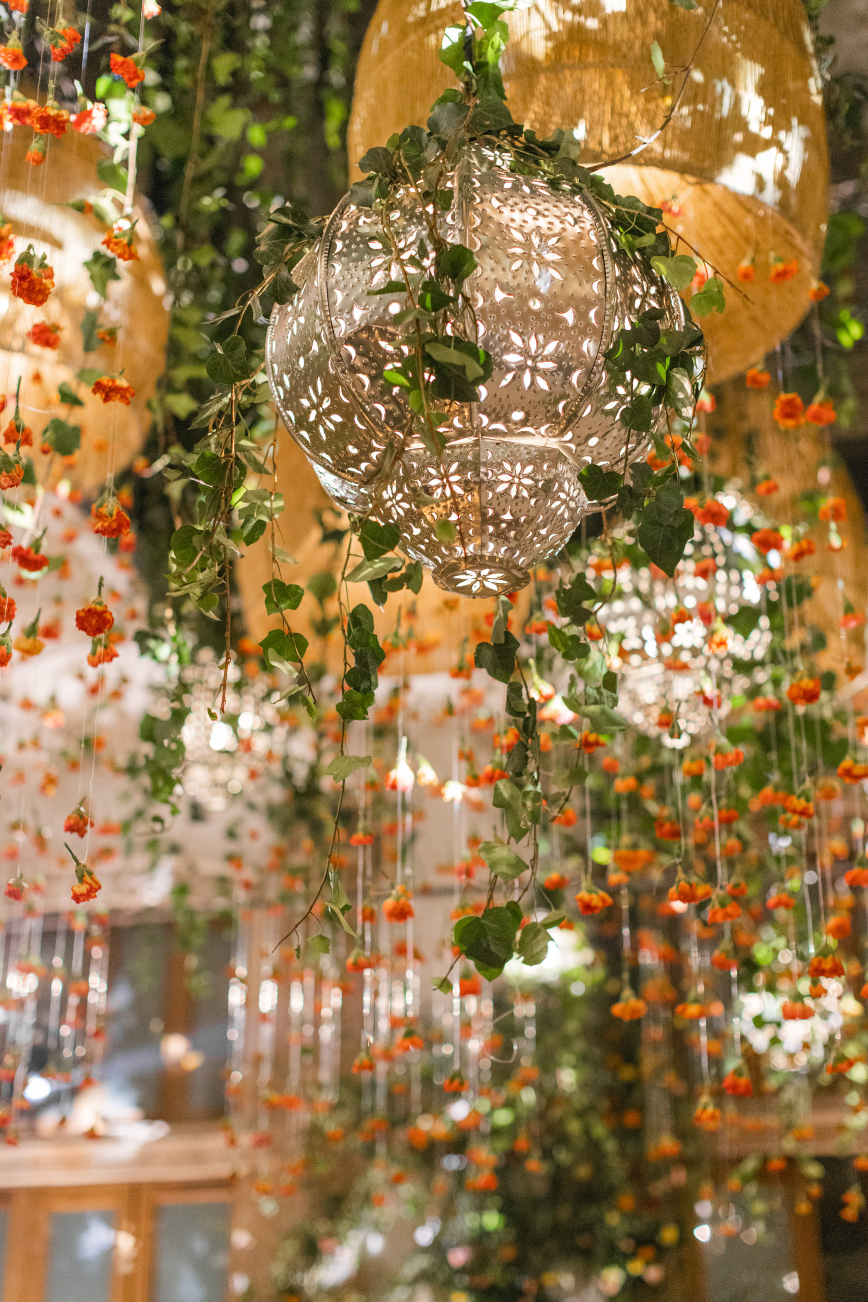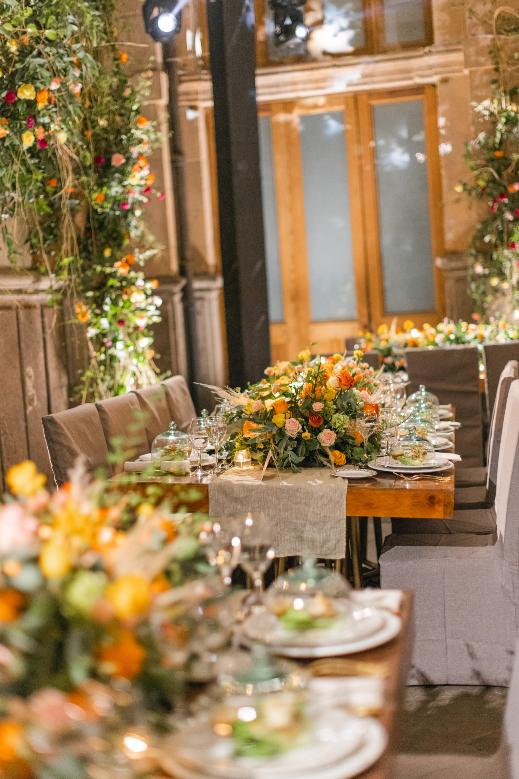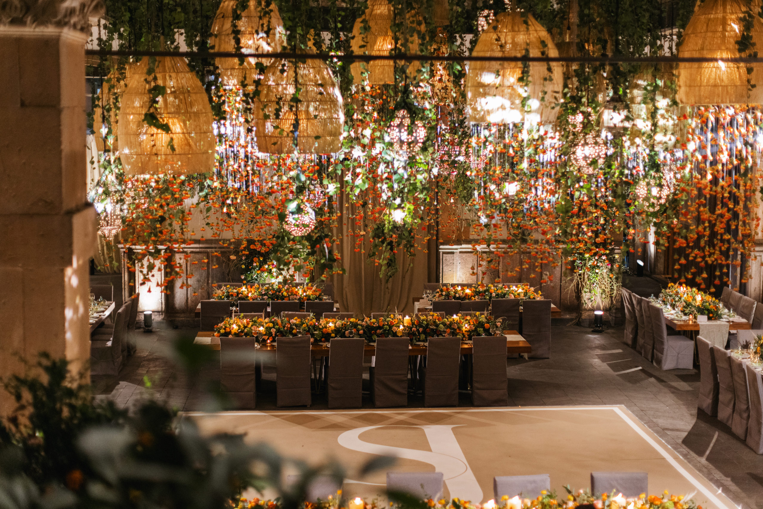 After this, it was time to head to the reception. The decor featured hanging vines from the ceiling with orange, yellow, and pink blooms and tables were decorated with center pieces to match. Table settings had a bit of an art deco feel and featured soft gold geometric designs.