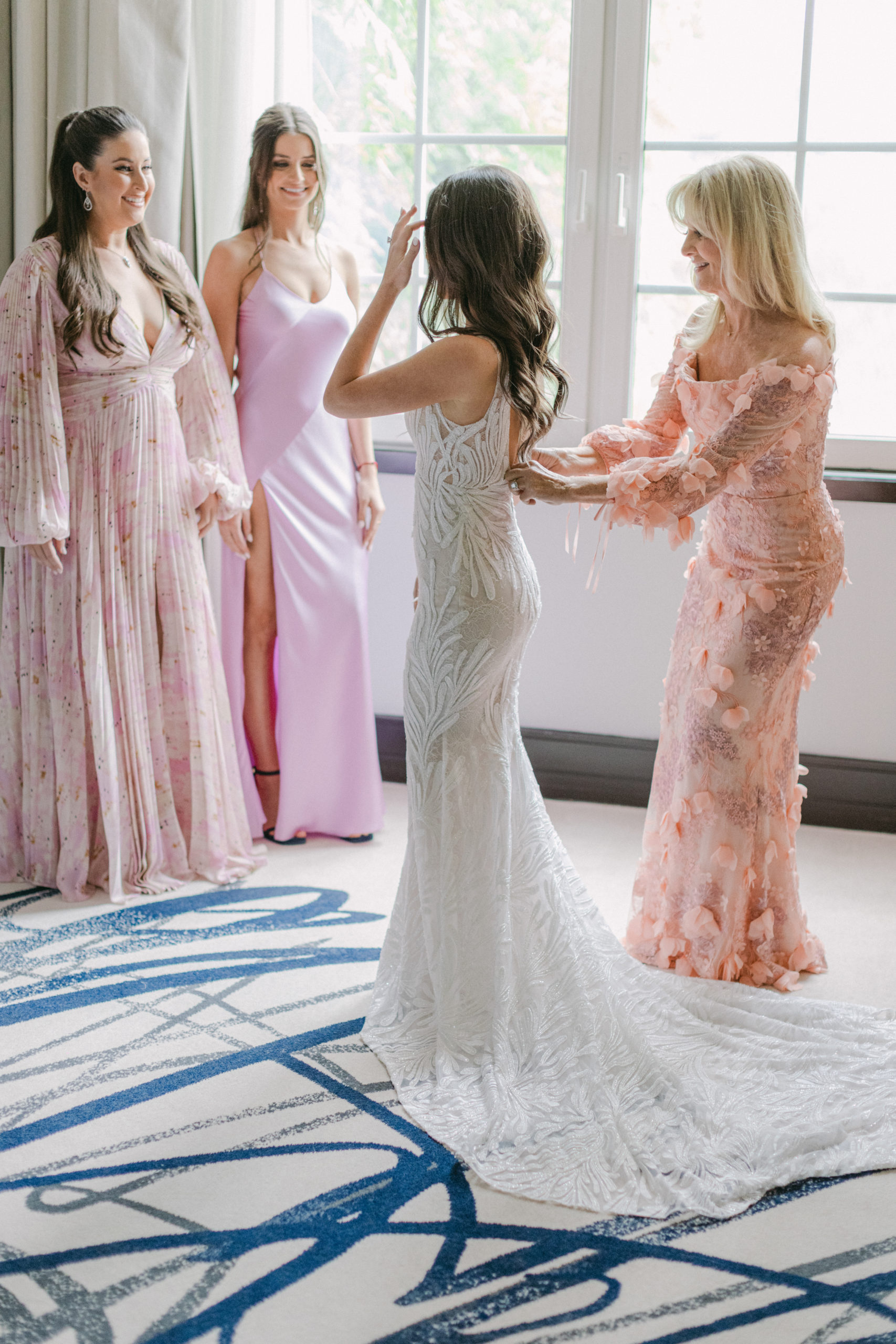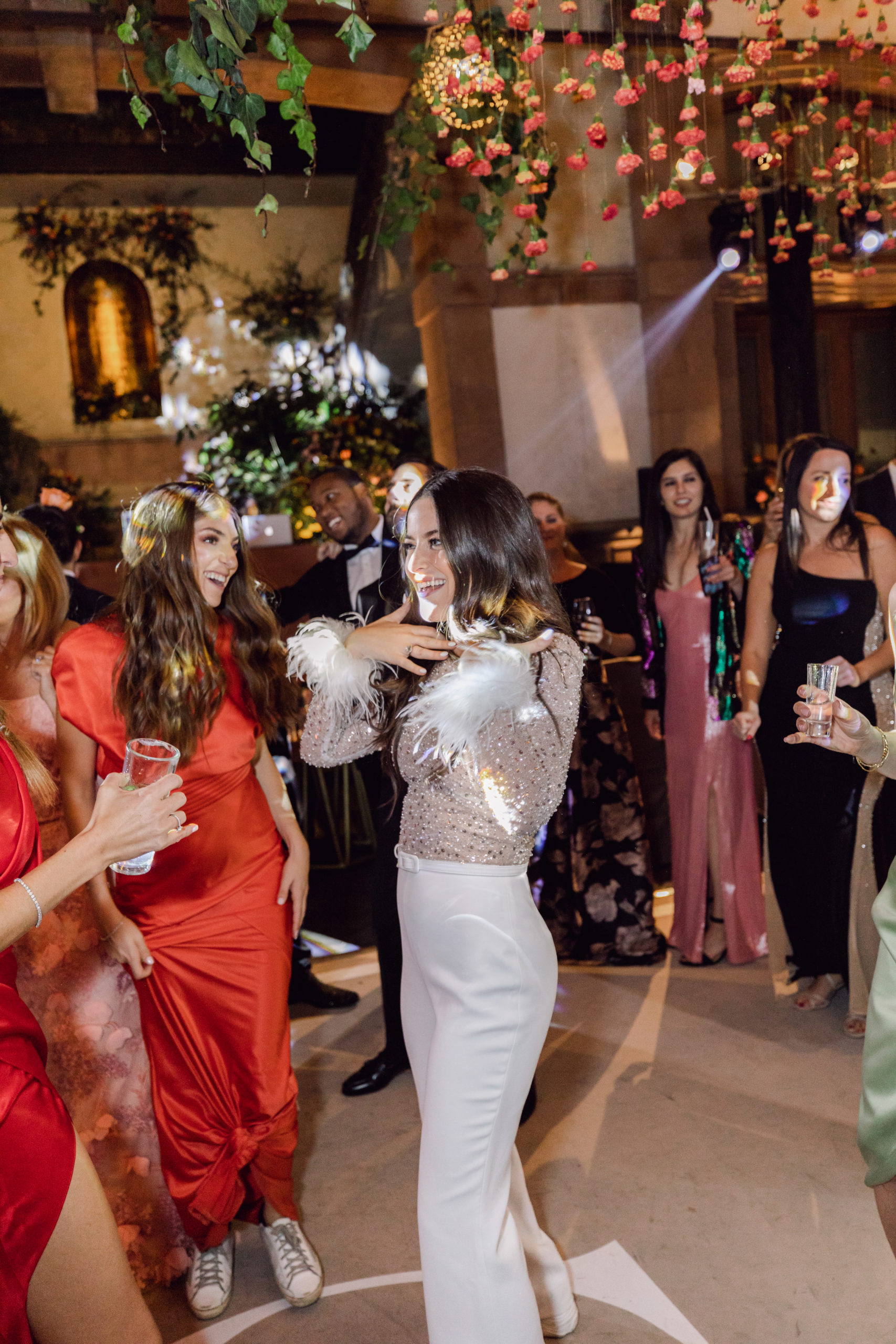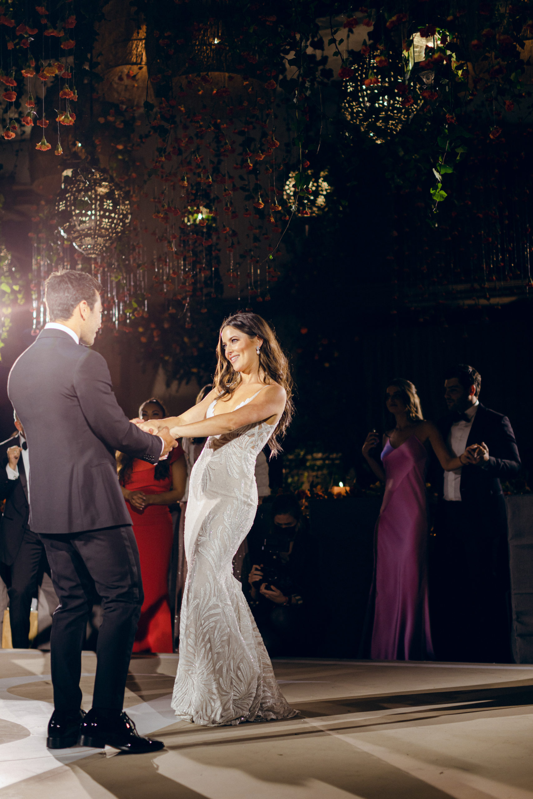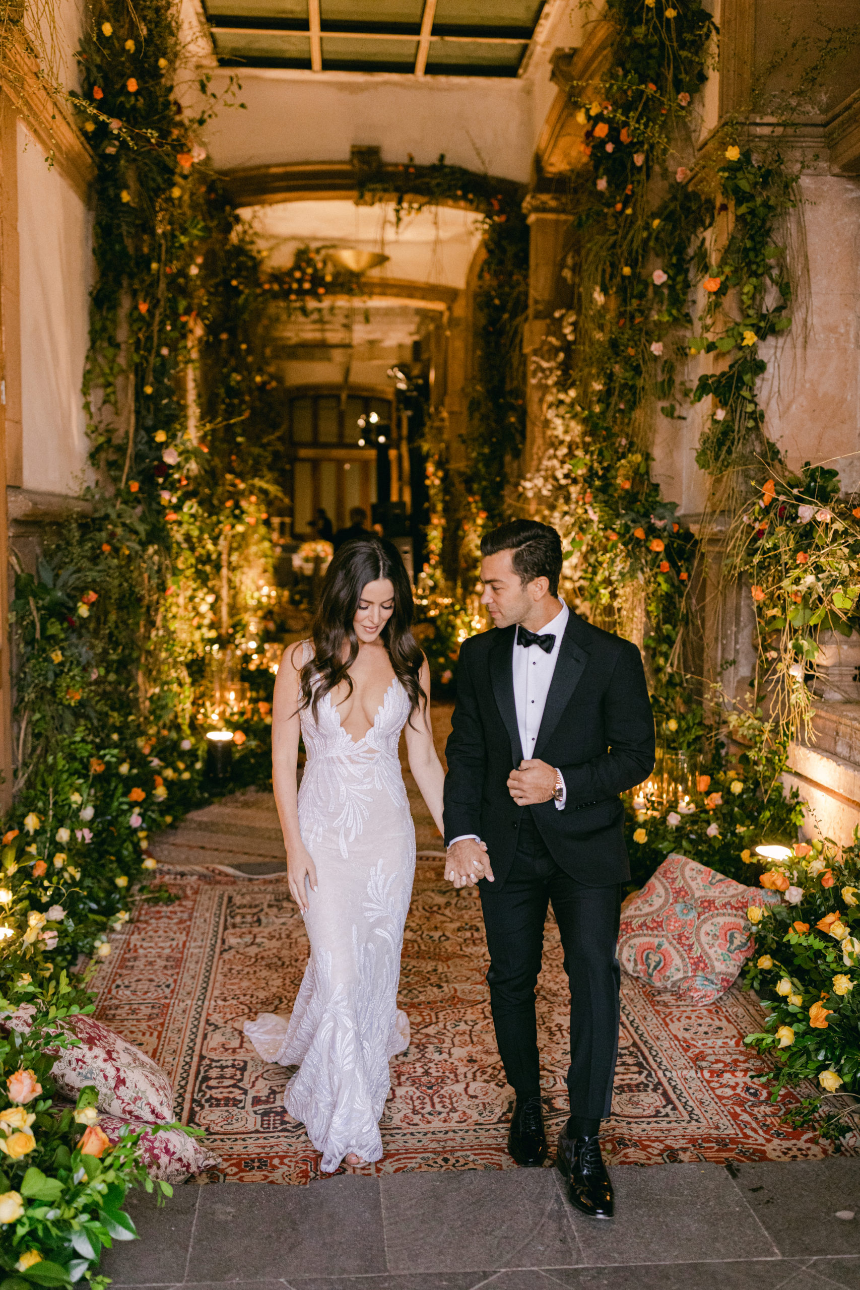 After this, it was time to head to the reception. The decor featured hanging vines from the ceiling with orange, yellow, and pink blooms and tables were decorated with center pieces to match. Table settings had a bit of an art deco feel and featured soft gold geometric designs.