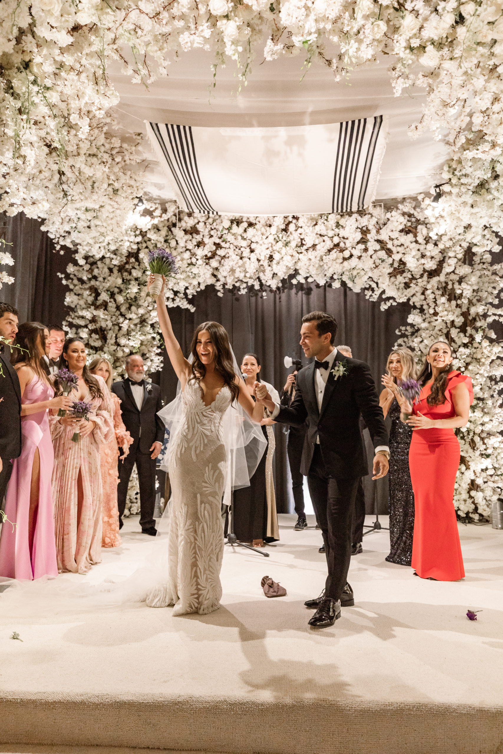 At the ceremony, the Bride walked down the aisle that was completely covered in all white flowers as was the huppa where they said their vows and ‘smashed the glass’ as part of the Jewish tradition. They were surrounded by their closest friends and family on this beautiful day.